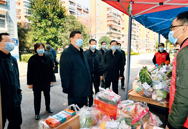 2020年3月10日,中共中央总书记、国家主席、中央军委主席习近平专门赴湖北省武汉市考察新冠肺炎疫情防控工作。这是习近平在东湖新城社区生活物资集中配送点,详细询问社区群众生活物资采购和供应情况。(新华社记者 谢环驰/摄)
