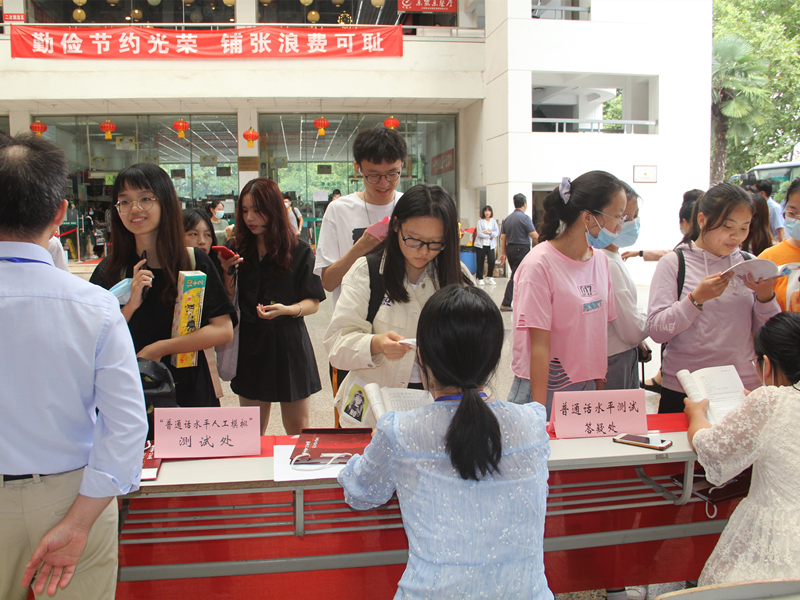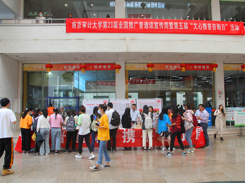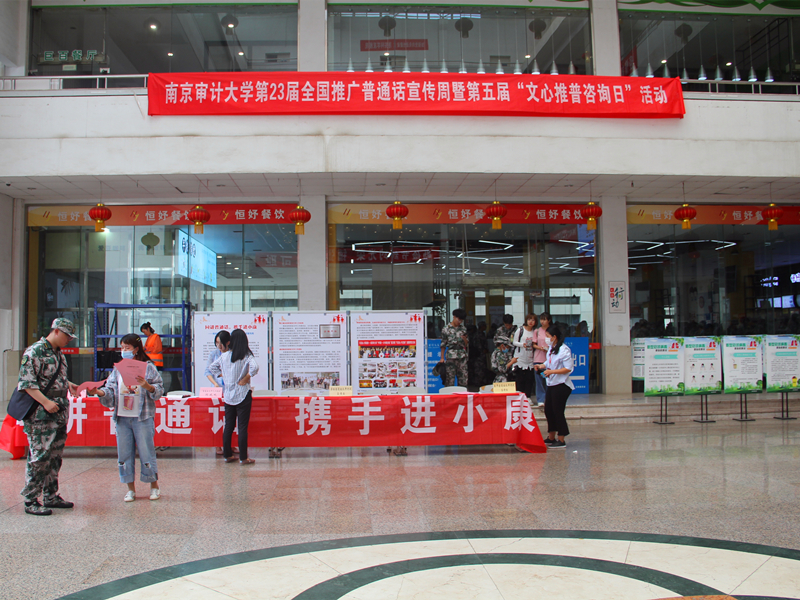 9月14日至20日是第23届全国推广普通话宣传周,根据江苏省语言文字工作委员会《关于开展第23届全国推广普通话宣传周江苏省系列活动的通知》的要求,9月18日中午,以“同讲普通话,携手进小康”为主题,校普通话培训测试站在沁园餐厅一楼大厅开展第23届全国推广普通话宣传周暨第五届“文心推普咨询日”活动。