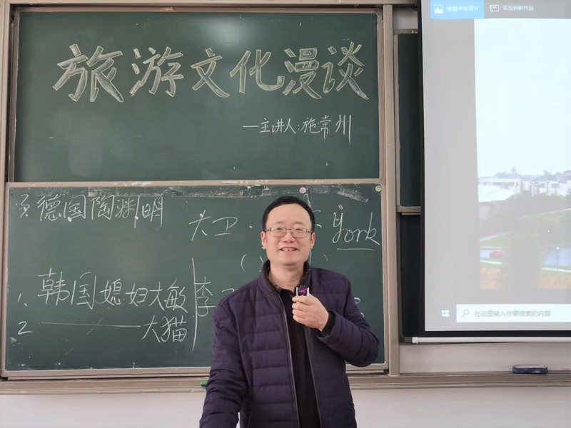 首先,施常州从“读万卷书,行万里路”的辩证关系切入,强调读书与旅游并行的意义,提出旅游文化博大精深的观点。接着,他以国内安徽和西藏等地为例,介绍了旅游文化之深远意义。他向同学们展示了国内一些旅游照片,并讲述了旅行中发生的趣事以及其中包含的文化内涵。