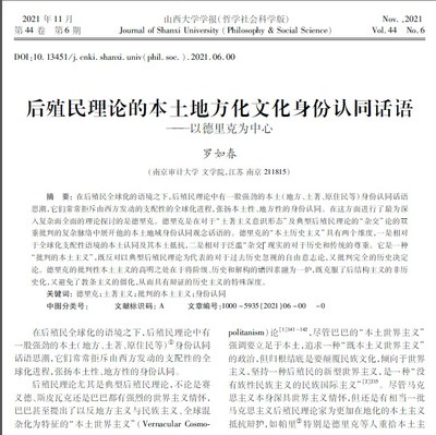 一、公司罗如春教授近期拟在《山西大学学报(哲学社会科学版)》发表1篇C刊:《后殖民理论的本土地方化文化身份认同话语——以德里克为中心》。
