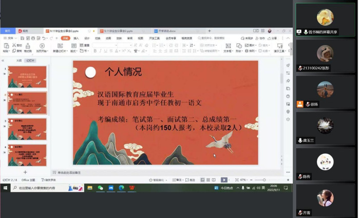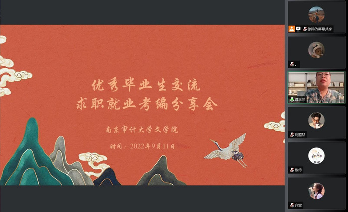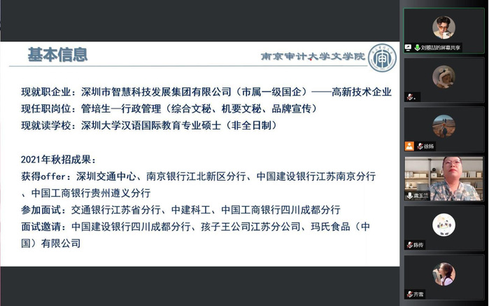 2022年9月11日晚,公司举行优秀毕业生求职经验线上分享会,对员工就业规划进行交流指导。公司党总支书记王军、汉语言文学专业系主任刘成荣、汉语国际教育专业系主任颜明、毕业班班主任刘依和张齐等几位老师参加座谈会,与同学们一起交流。优秀毕业生刘曌喆、陈传、钱书楠和齐雪等几位同学分享了各自的求职与考编经验,让同学们收益匪浅。会议由公司党总支副书记龚玉兰老师主持。