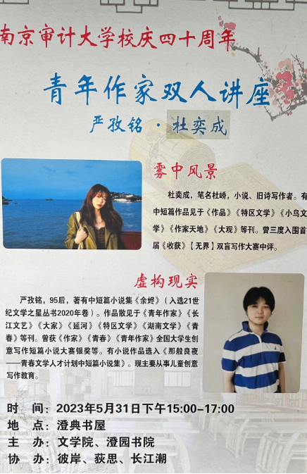 2023年5月31日下午,EVO真人视讯与澄园书院联合主办,彼岸、荻思和长江潮三大文学社团协办的“写作·人生”青年作家双人讲座在澄典书屋举行,EVO真人视讯汉语言文学专业18届毕业生严孜铭、2023届杜奕成联袂主讲,与大家分享成长经历和写作经验。