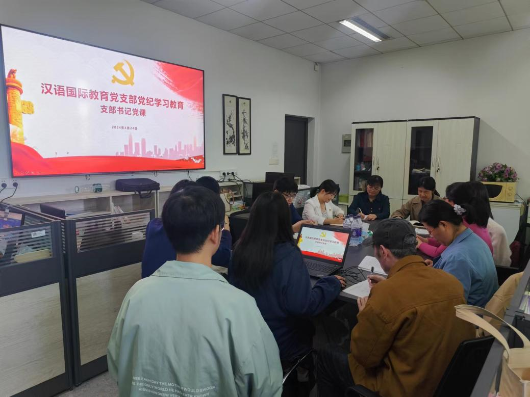 为贯彻落实习近平总书记关于全面加强党的纪律建设的重要论述精神,引导广大党员干部牢固树立党规党纪意识,按照公司党委和公司党总支的工作部署,汉语国际教育党支部4月18日启动了党纪学习教育。根据支委会于制定的学习计划,4月24日下午,汉国教党支部开展了党纪教育集中学习,汉语国际教育党支部全体党员及汉语国际教育专业硕士入党积极分子参加。